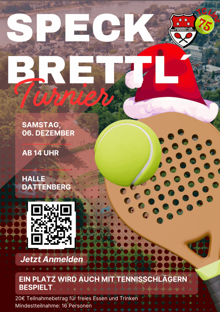 Am Samstag, den 06. Dezember, lädt der Tennisclub Rot-Weiss Linz e.V. herzlich zum traditionellen Speckbrettl-Turnier ein! Gespielt wird ab 14:00 Uhr in der Halle Dattenberg.